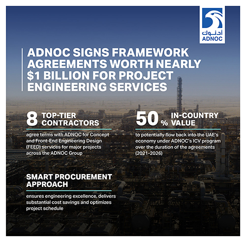 ADNOC had signed framework agreements worth up to $1 billion for Concept and Front-End Engineering Design (FEED) services for major projects across its full value chain.