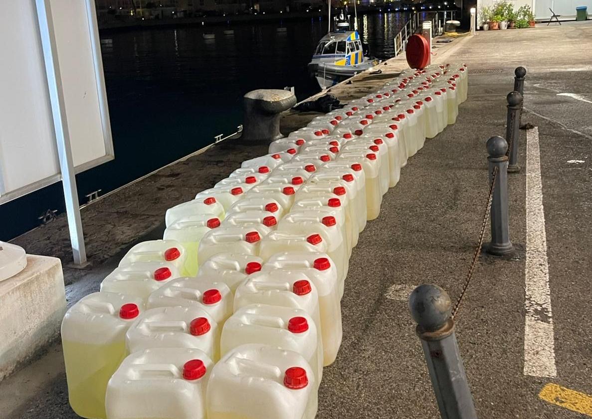 Gibraltar Customs has recovered 99 petrol containers following a dramatic early-morning chase at sea off Gibraltar that saw suspects attack the pursuing vessel before escaping.