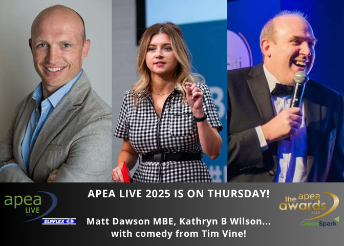 The preceding daytime Conference and Exhibition, sponsored by Elaflex, will be hosted by Broadcaster and Presenter, Kathryn B Wilson! f you have not registered your FREE place at the daytime Conference and Exhibition, now is the time! Your FREE daytime delegate pass provides access to all areas; the Conference, the Exhibition and all networking zones. Click here Book Tickets for APEA Live 2025