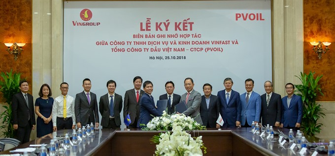 Vietnam's automaker VinFast and Vietnam Oil Corporation (PV Oil) on Thursday signed a Memorandum of Understanding (MoU) on implementing charging stations and leasing batteries for electric vehicles.
