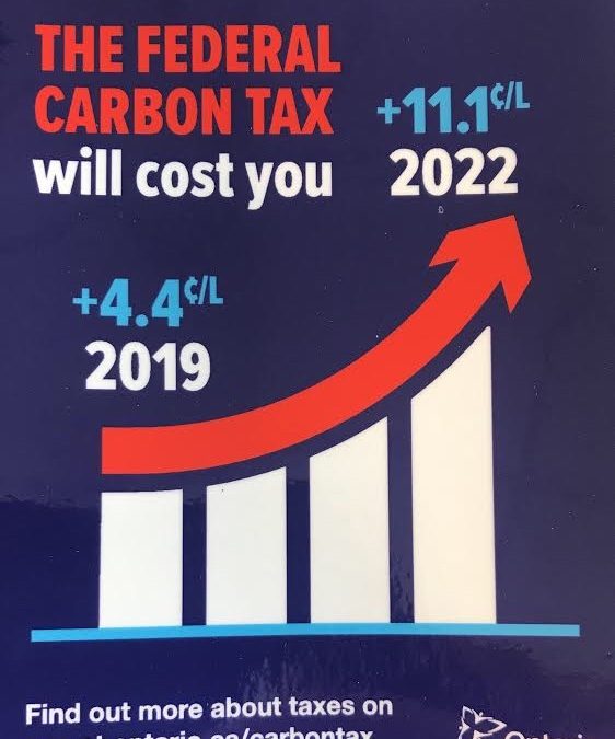 The notice is in reality a propaganda sticker which shows the federal carbon tax adding 4.4 cents per litre to the price of gas at present, rising to 11 cents a litre in 2022. The stickers will not reveal that Ontario residents will be obtaining tax rebates on income tax returns at $128 annually and $307 for a family of four.