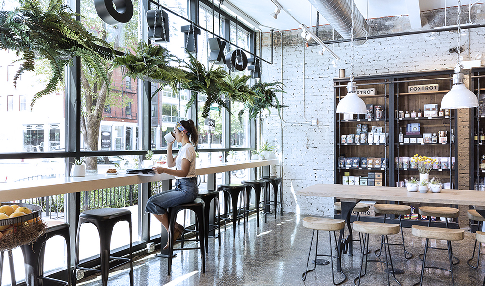 The Foxtrot stores, which even have comfortable couches in them, serve not only as an upscale, small-format combination restaurant/convenience store; they’ve also become community gathering places akin to a cafe. LaVitola says the chain’s revenue is divided about evenly between in-store sales and delivery.