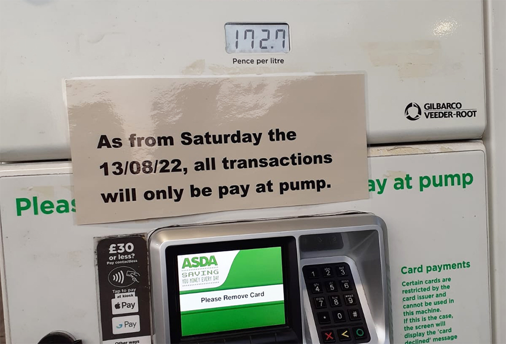The petrol station at the Asda supermarket in Newport, UK, has done away with cash payments with all transactions now pay at the pump only.