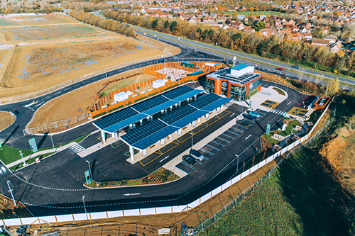 This first Electric Forecourt, built adjacent to Great Notley, a suburban development, is located just off the A131 and enables 36 EVs to be charged simultaneously with high high-power chargers that can deliver up to 350 kW of charging power.