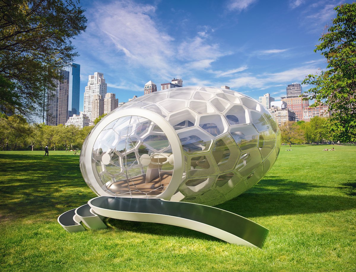 Other projects in the series include a classroom where students use a hologram of the earth, and an app that directs users to businesses that only use sustainable fuels and materials. The Greenpod looks like a transparent egg and would sit in a park or other public space. Anyone could book one to use as an office or meeting space, Kammonen says.